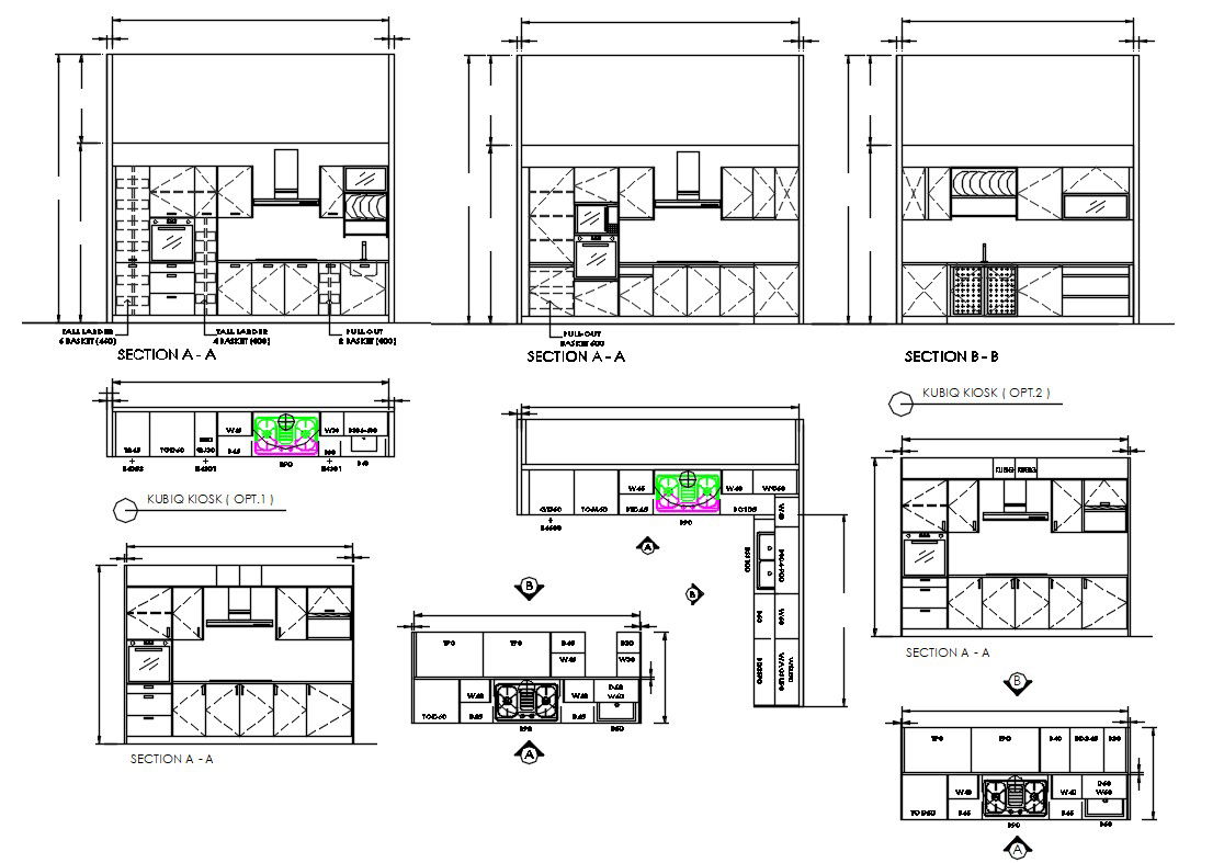 Kitchen Interior Elevation Design AutoCAD File; 2d CAD drawing of kitchen interior design with 3 different options in CAD drawing. download kitchen interior project DWG file and get more detail about furniture elevation detail.