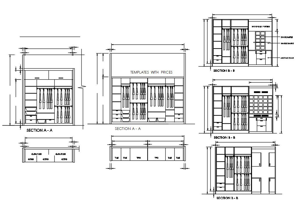 Wardrobe CAD Drawing; wardrobe open elevation design 5 different option CAD drawing includes drawer and cupboard closet.