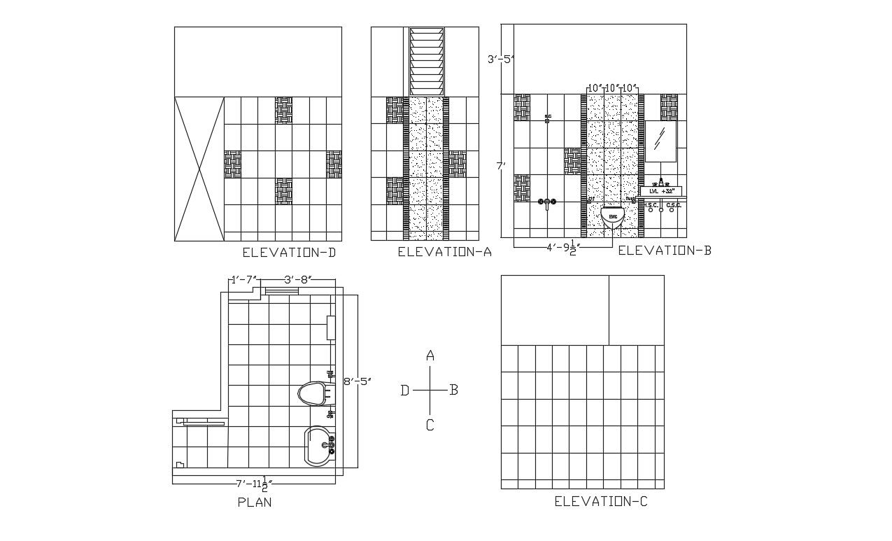 Elevation and plan details of sanitary toilet design which also shows sanitary ware details in restroom Download CAD file for free.
