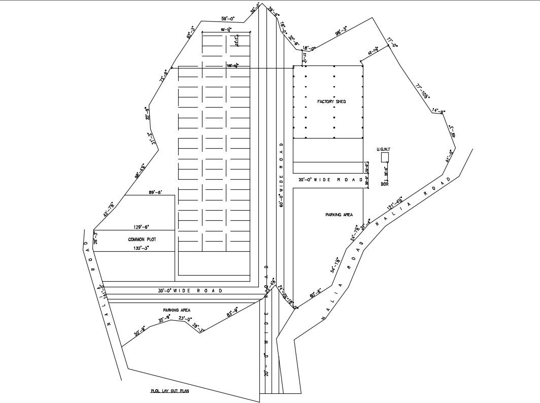 Master Plot Layout Plan AutoCAD File Free; master plan of plotting with surrounding detail which is factory shad parking area , main roads and also master plot dimension, CAD file free.