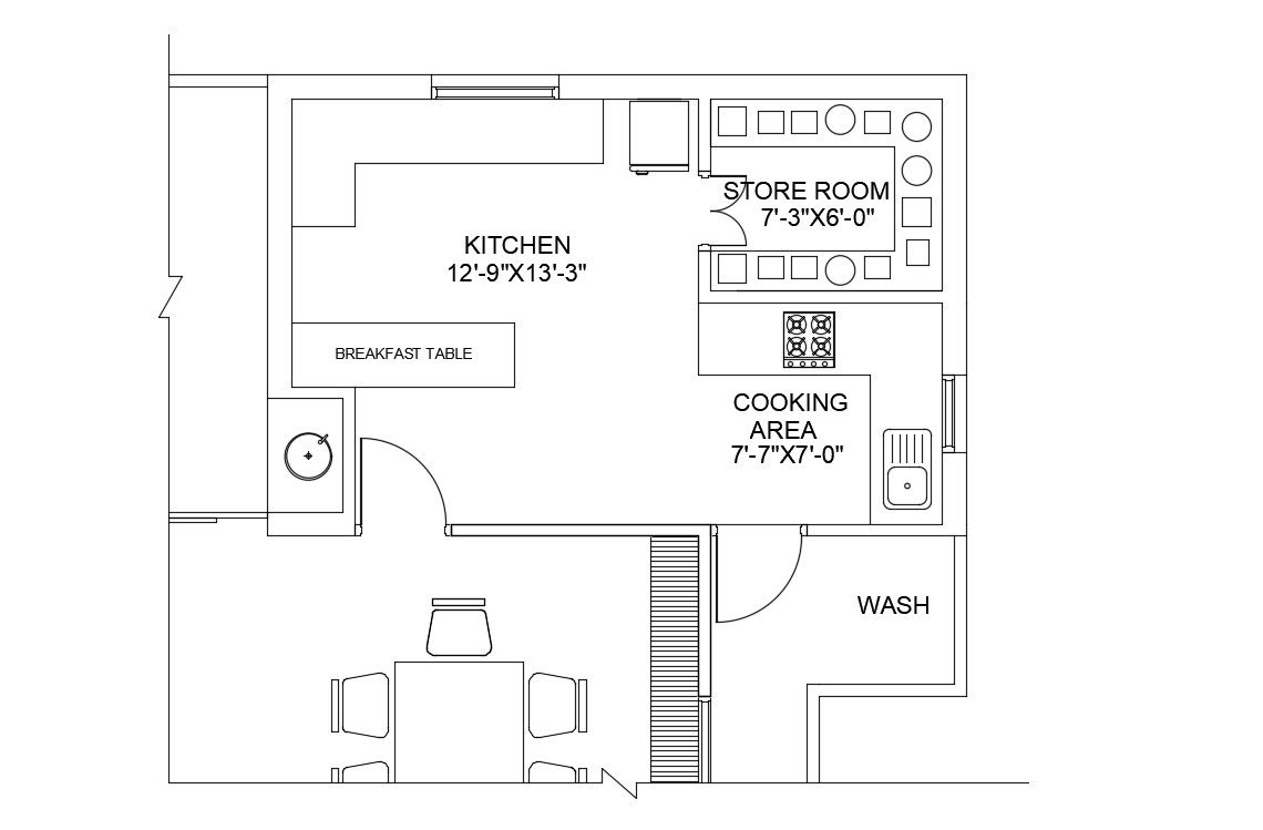 Kitchen floor plan Design that shows kitchen furniture and automation blocks arrangement details along with kitchen interior dimension details.