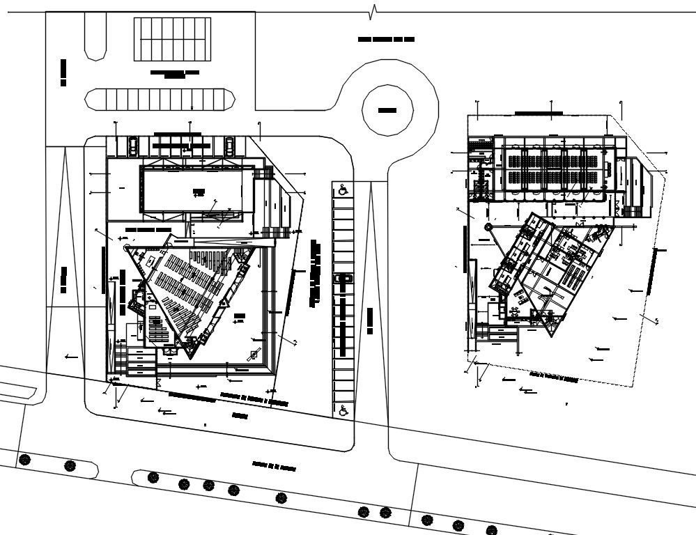 Dormitory Floor Plan DWG File; 2d CAD drawing of ground floor wide auditorium plan, and parking area. the first-floor plan includes dormitory room, offices and hall detail. download architecture plan DWG file with all furniture details.