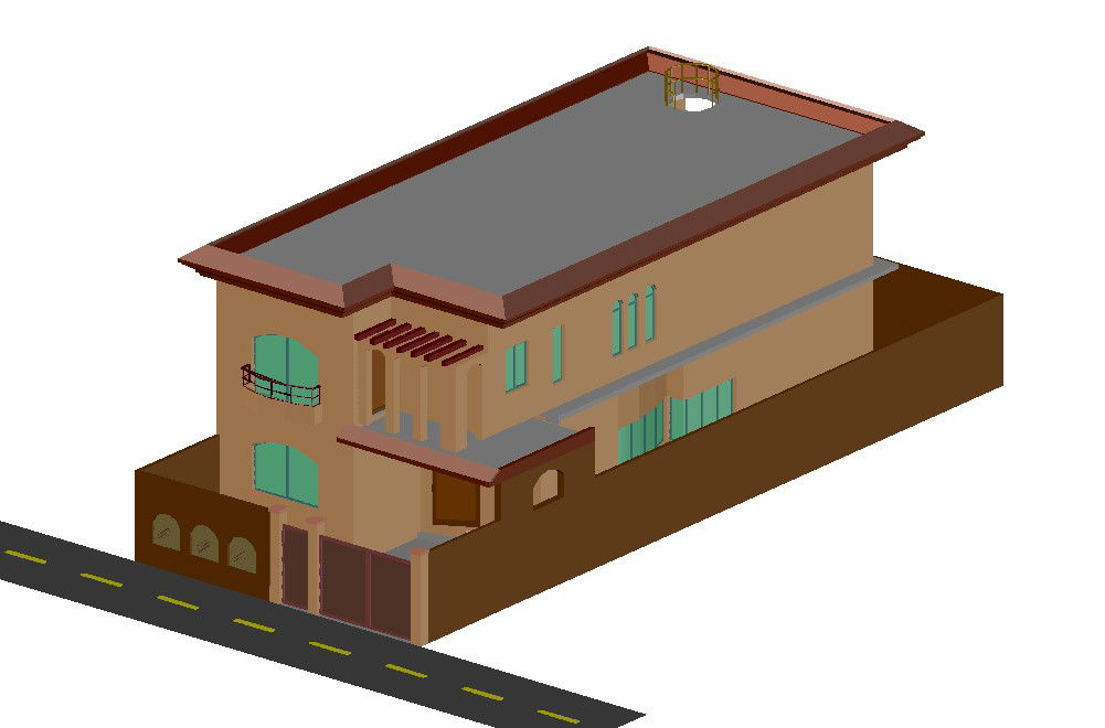 3d House Model DWG File; download 2 storey house model AutoCAD file includes compound wall, entrance gate, balcony view and wall colour suggestion.