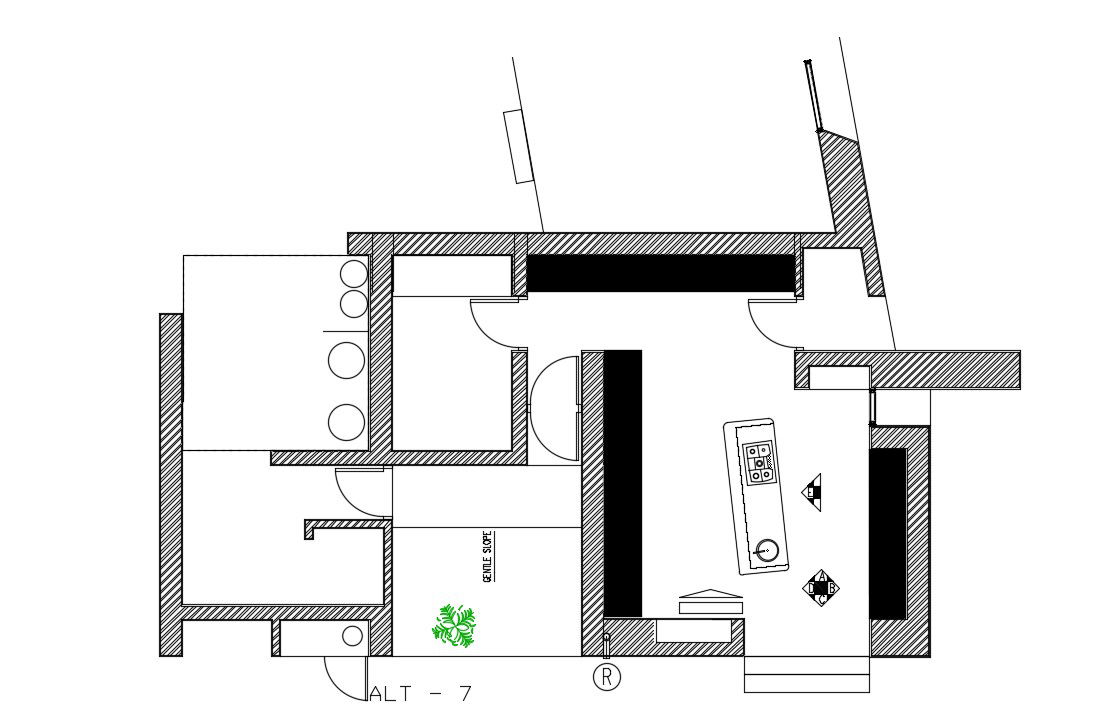Kitchen designing CAD Drawing download file for free that shows the floor plan of kitchen area along with other room details and various other detailing.
