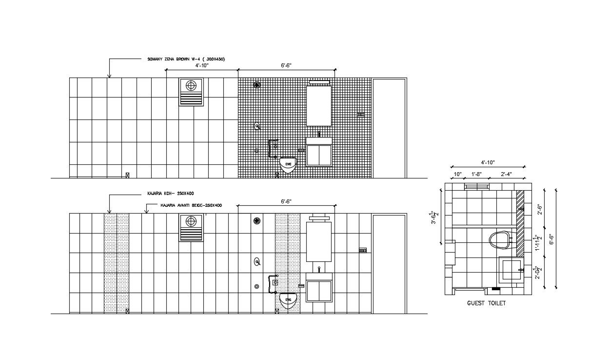 Bathroom Design Plan and elevation Drawing that shows sanitary ware details of the water closet, washbasin, dressing table in the bathroom, and various details of bathroom download CAD file.