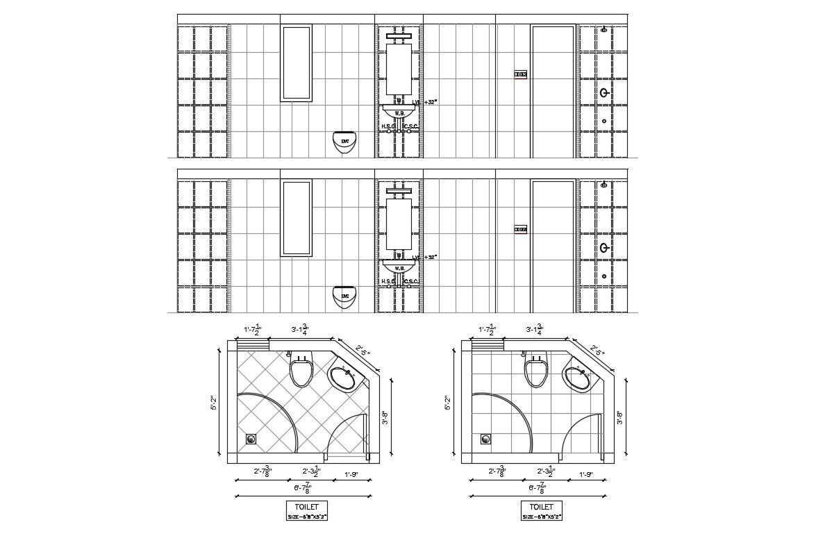 Download CAD drawing details of bathroom plan and elevation design along with bathroom sanitary ware details of the water closet, washbasin, corner bath-tub, plumbing blocks, and other unit details.