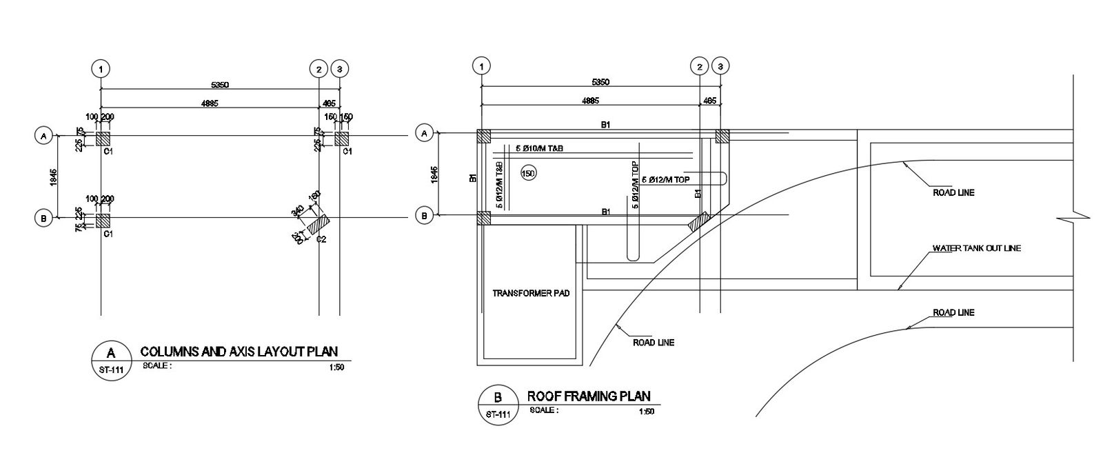 Columns and axis layout plan dwg file; shows the details of the roof framing plan with road line and water tank outline. Spacing between two columns along with column size and dimensions details.
