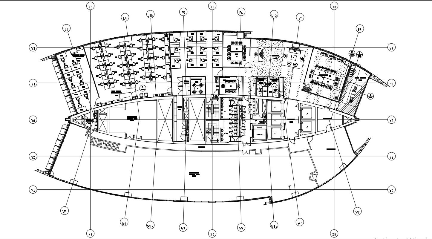 Commercial building cad file; includes the details of the reception area, work station, private cabins, pantry area, conference hall.