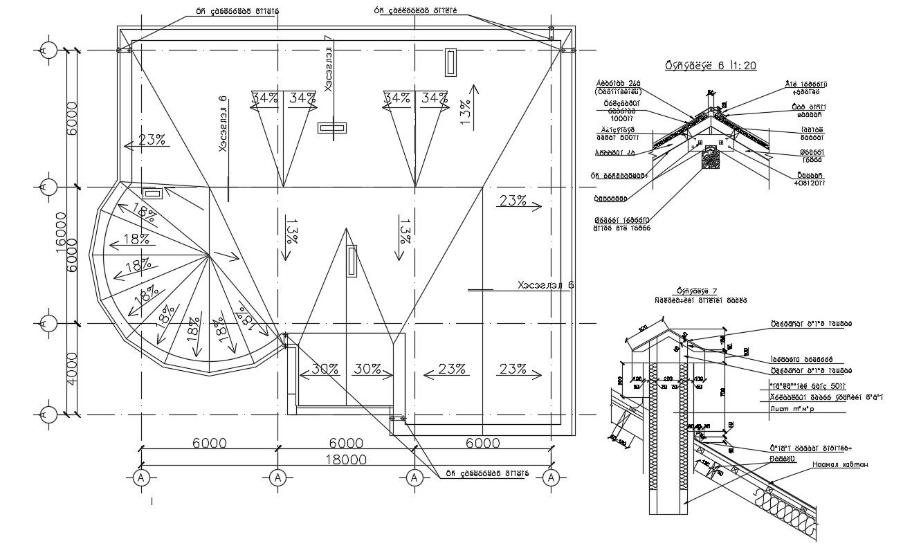 Roof Framing Plan With Truss Design CAD File; detail section of truss and texting , dimension, some slopping detail for RWP Auto CAD File Free.