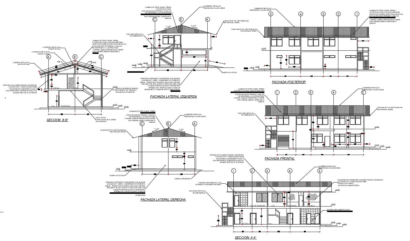 Commercial building Design drawing that shows building different sides of elevation details along with sectional details of building, roofing structure detail at the ceiling, floor level, and various other details download CAD drawing.
