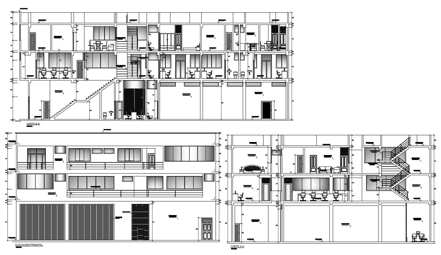 Elevation and sectional details of office design with a residential place provided on the upper floor, Download CAD drawing for more detail working drawing.