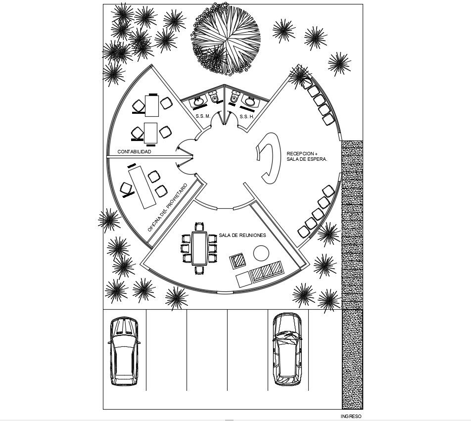 Office building design Furniture layout CAD plan downloads file for free that also shows parking space details, boundary compound wall, landscaping, and various other details.