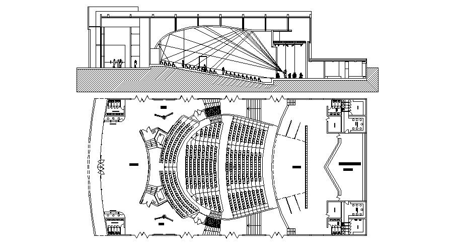 Auditorium Plan And Section DWG File; the ground floor plan and cross section view shows seating arrangement and stage detail. download AutoCAD file of the auditorium seating sec.tion with floor detail.