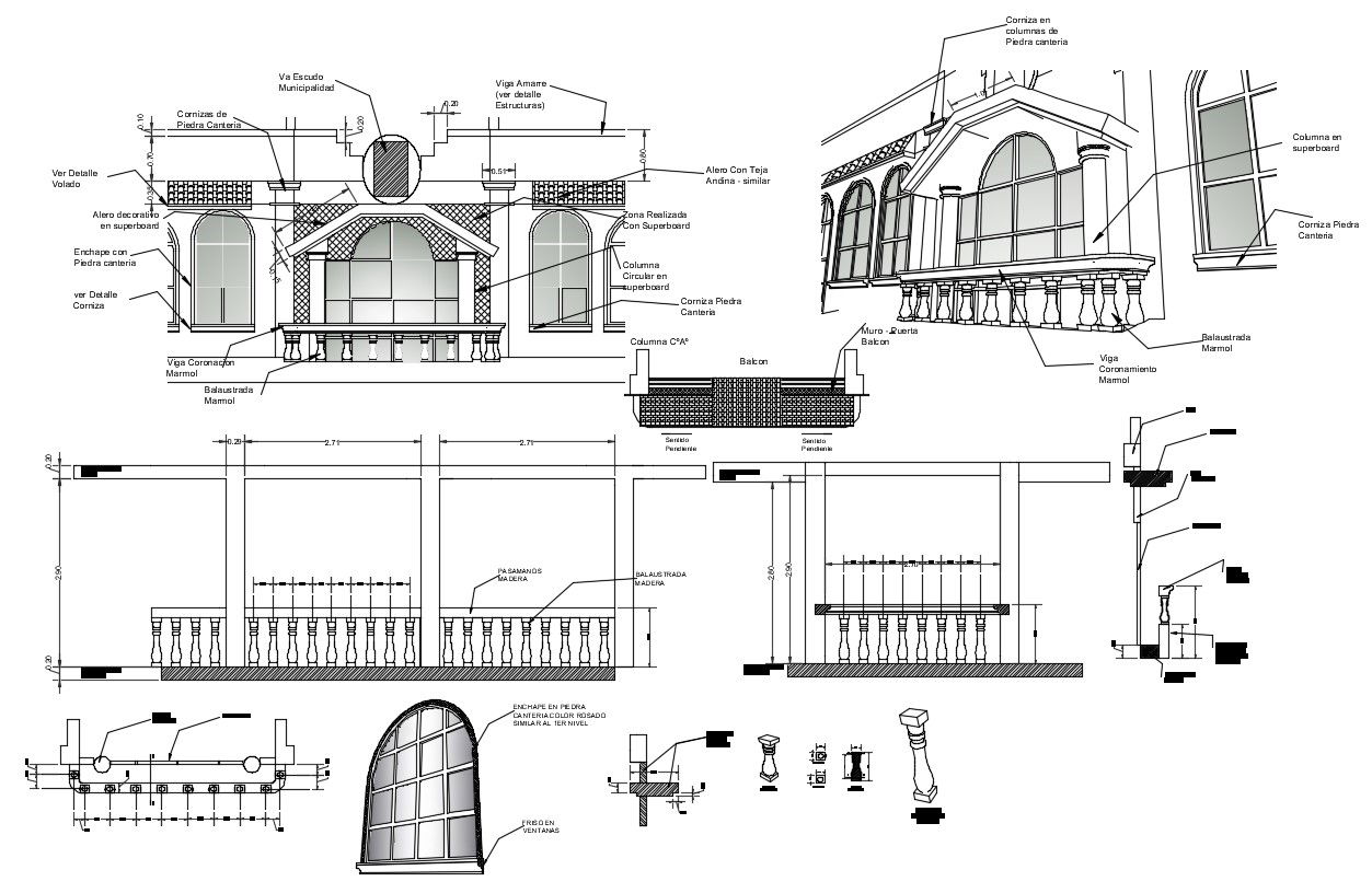 CAD Drawing details of house front view details along with balcony details, baluster details, door and window block details, and various details download the file.