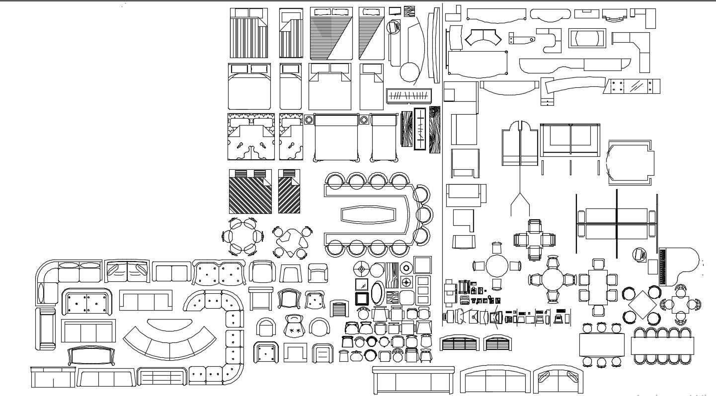 Furniture dwg file; shows the different type of bed, chairs, table, sofa set, dinning table. Also shown the top view elevation of the furniture.