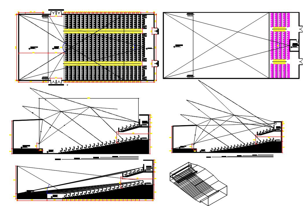 Auditorium Plan DWG File; download free AutoCAD file of auditorium project shows ground floor plan and first floor with seating arrangement side view.
