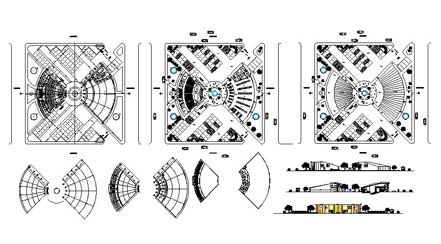 City Central Building DWG File; the architecture city centre building floor plan includes auditorium hall, library, shopping mall and parking area along with sectional and elevation design.