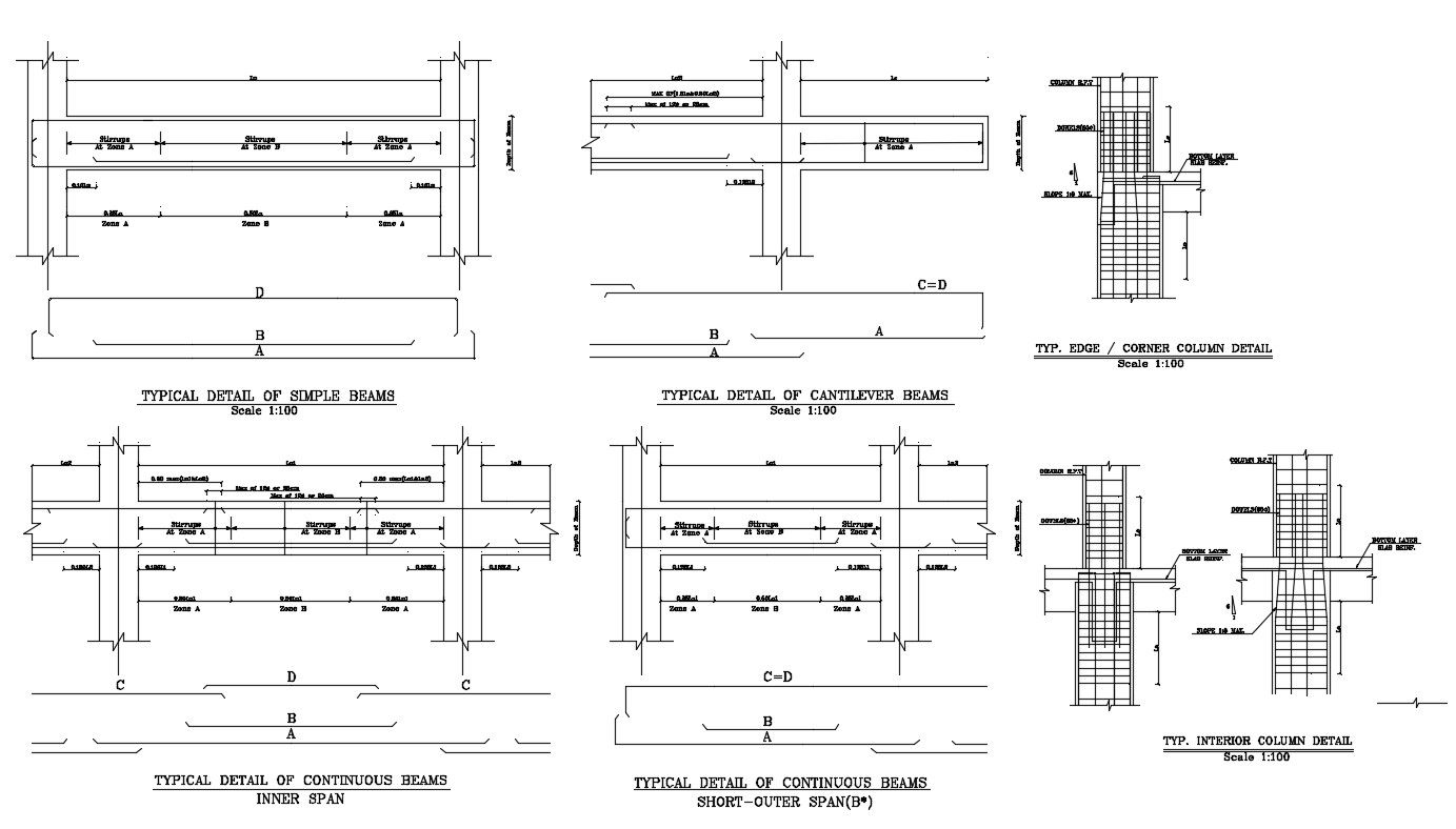 Column and Beam RCC structure Design that shows beam span details along with connection and joints details, column spacing details, reinforcement main and distribution details, and various other structural blocks detailing download CAD file.