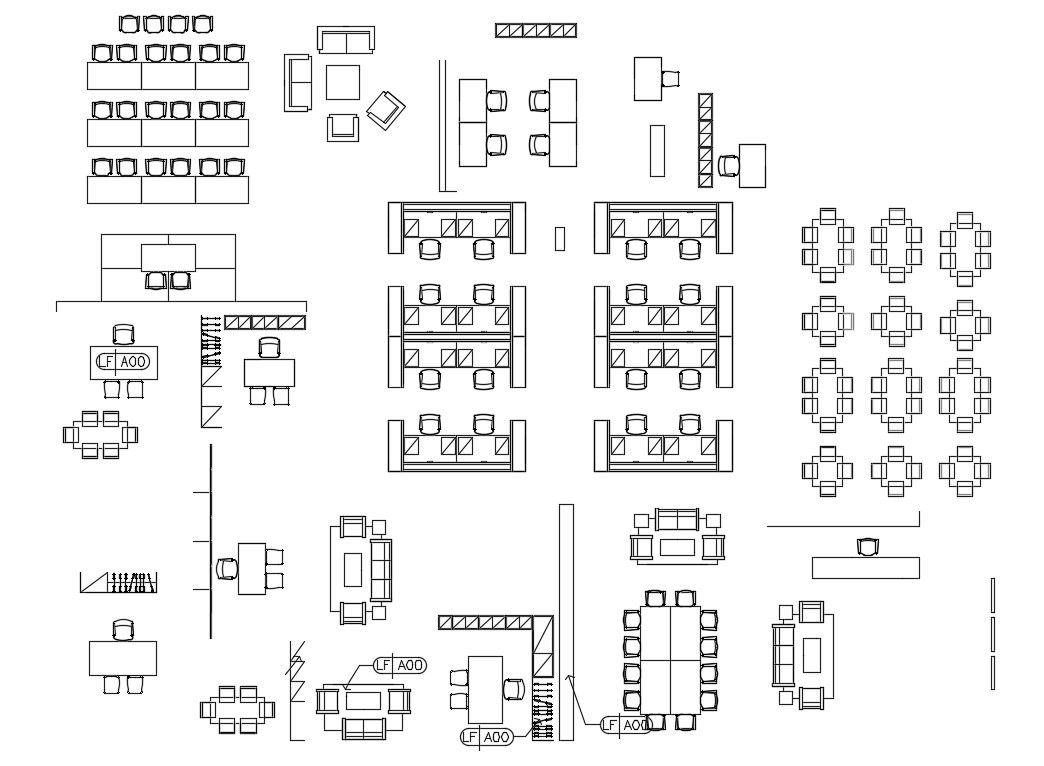 Top elevation drawing of office furniture table and chair blocks that show table shape and design details, download CAD drawing for free.