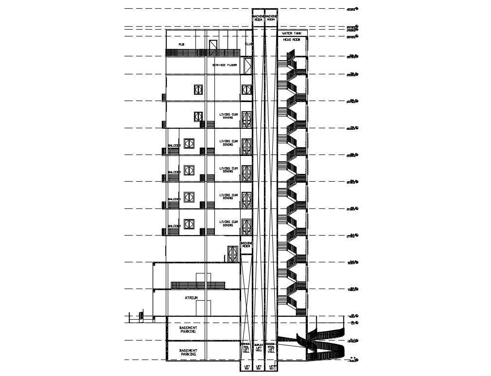 Multi-Story Section Detail DWG File Free; Section of multi-story apartment detail includes levels, texting, and much more detail related to flat CAD file free.