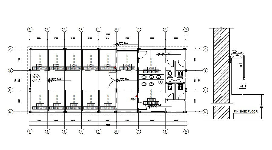 Working plan details of the building design that shows column structure details in building along with sanitary area details, centerline details of the building, dimension and other unbits details download CAD file.