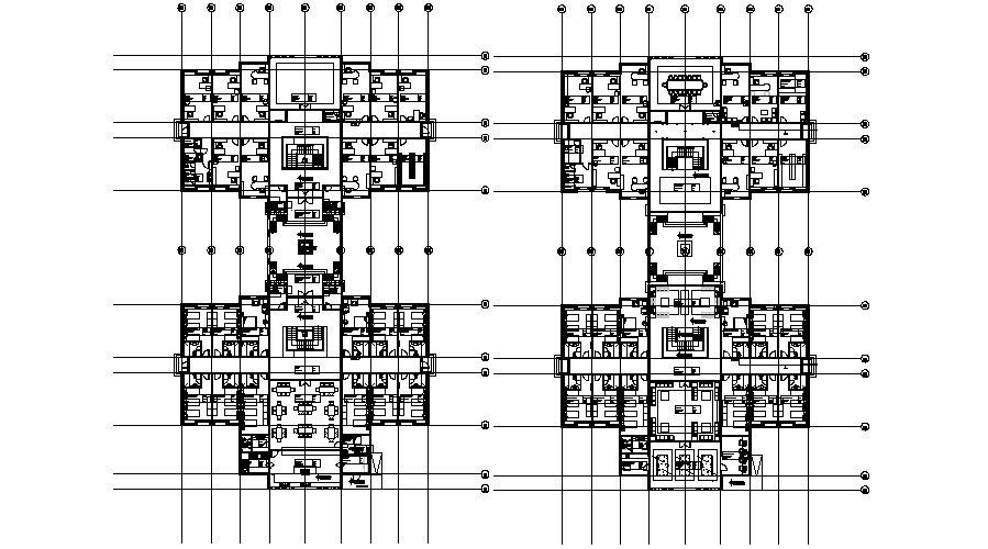 Furniture layout details in commercial building design that shows building floor level detailing along with working set dimension details, rooms and cabins details, and various other details.
