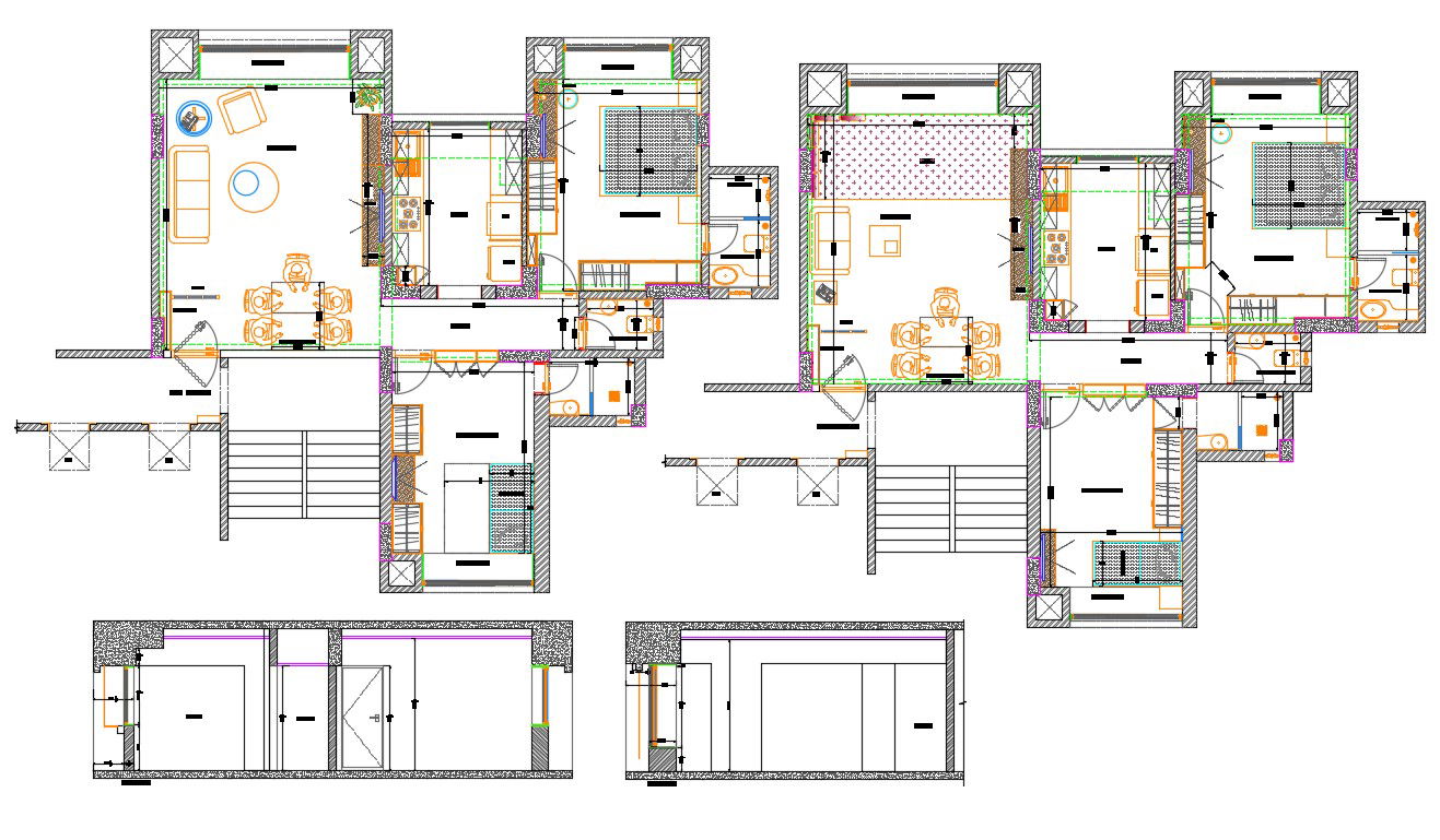 Section and furniture layout plan details of one BHK residential house that shows room details of one-bedroom, drawing room, the kitchen provided in the house along with room dimension working text details.
