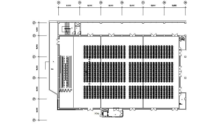 Auditorium CAD drawing; shows the details of the stage with seating arrangement and also with the doors. Dimensions details are also shown.