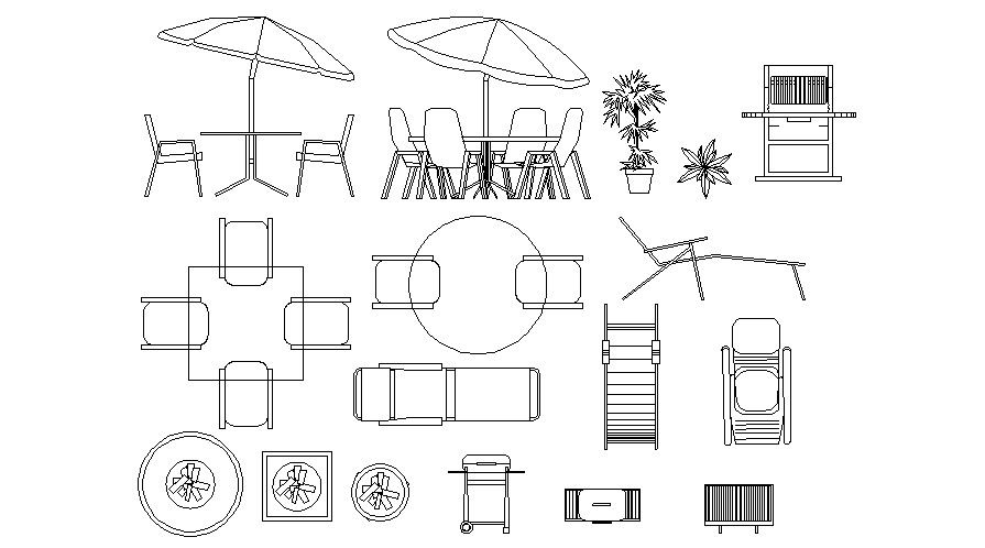 Furniture units elevation 2d drawing that shows top elevation of table and chair, relaxing chair-side elevation details, download CAD drawing for free.