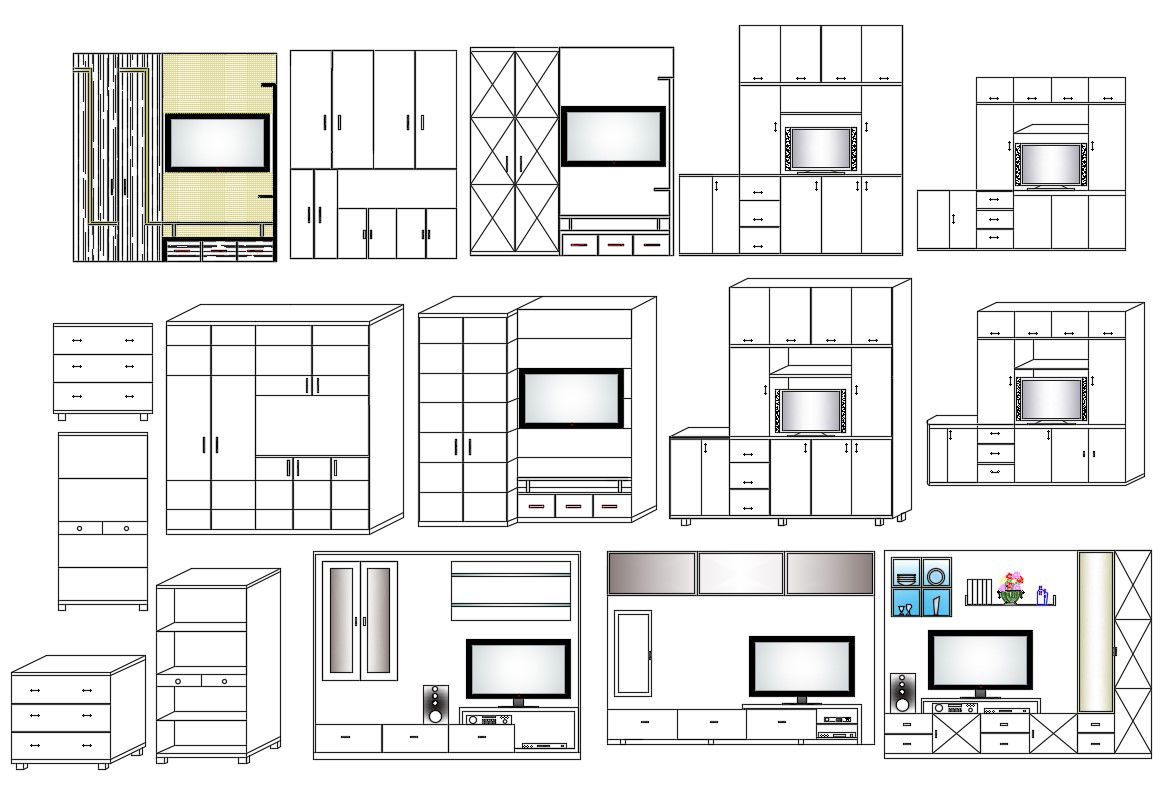 Furniture design details of a showcase for a living door that shows TV units place details along with shelves and cabinets details, Showcase furniture front elevation is shown in drawing download CAD file for free.
