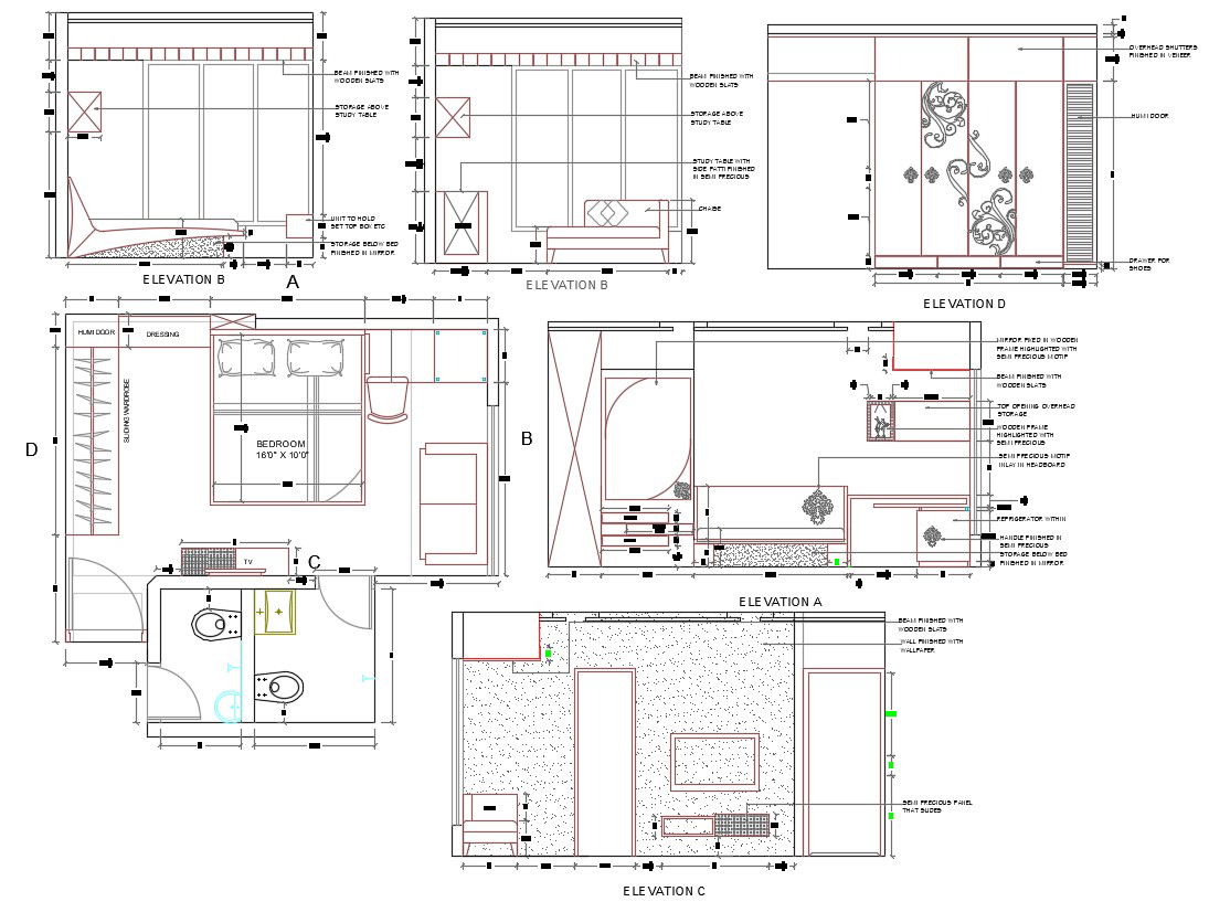 Bedroom plan and elevation design that shows furniture layout arrangement details in the room along with bedroom attached sanitary toilet and bathroom details download a CAD file.