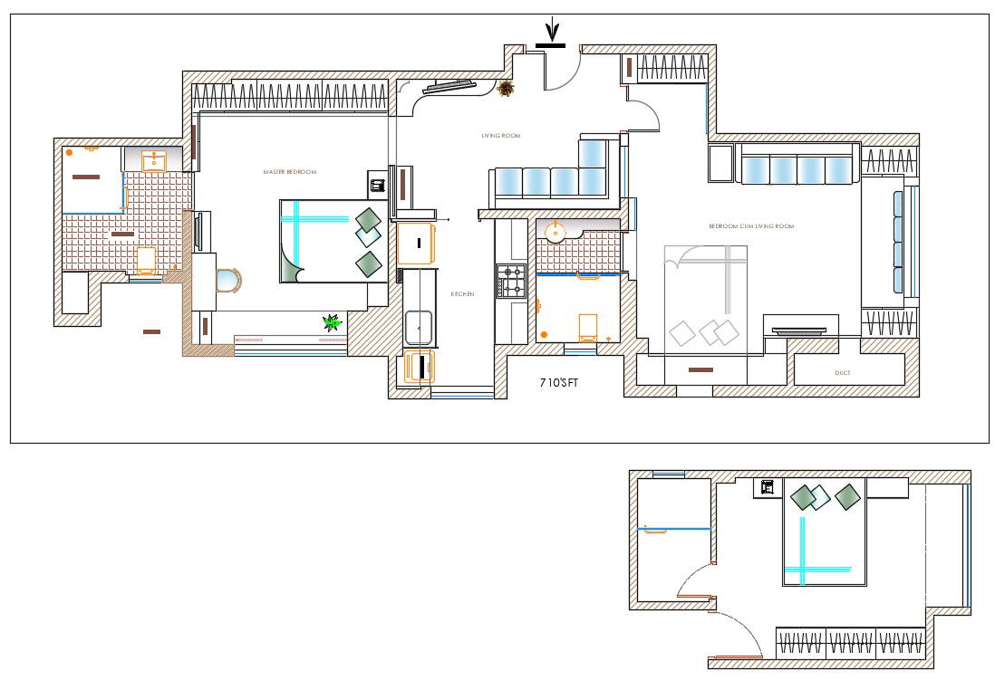 CAD drawing details of residential house furniture plan that shows room details of one drawing, 2 bedrooms, kitchen dining area, sanitary toilet and bathroom details provided in house download drawing for the detail work plan.
