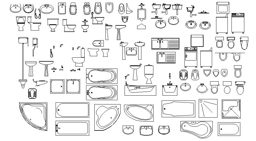 Sanitary Ware CAD Blocks; Download free CAD blocks of sanitary ware shows bathtub, toilet tub, and washbasin.