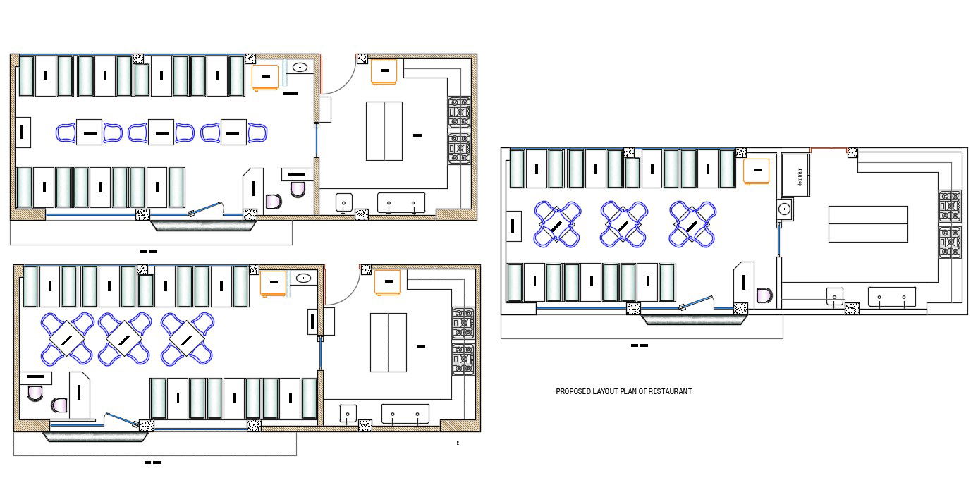 CAD drawing details of small restaurant plan that shows dining area and kitchen area details of restaurant along with furni9turee arrangement details in building download file.