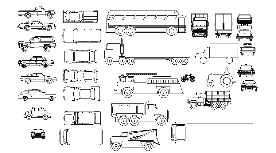 Vehicle Free Cad Blocks; download free AutoCAD file of Vehicle Cad Blocks shows car, truck, and bus with top view, side, and front elevation.