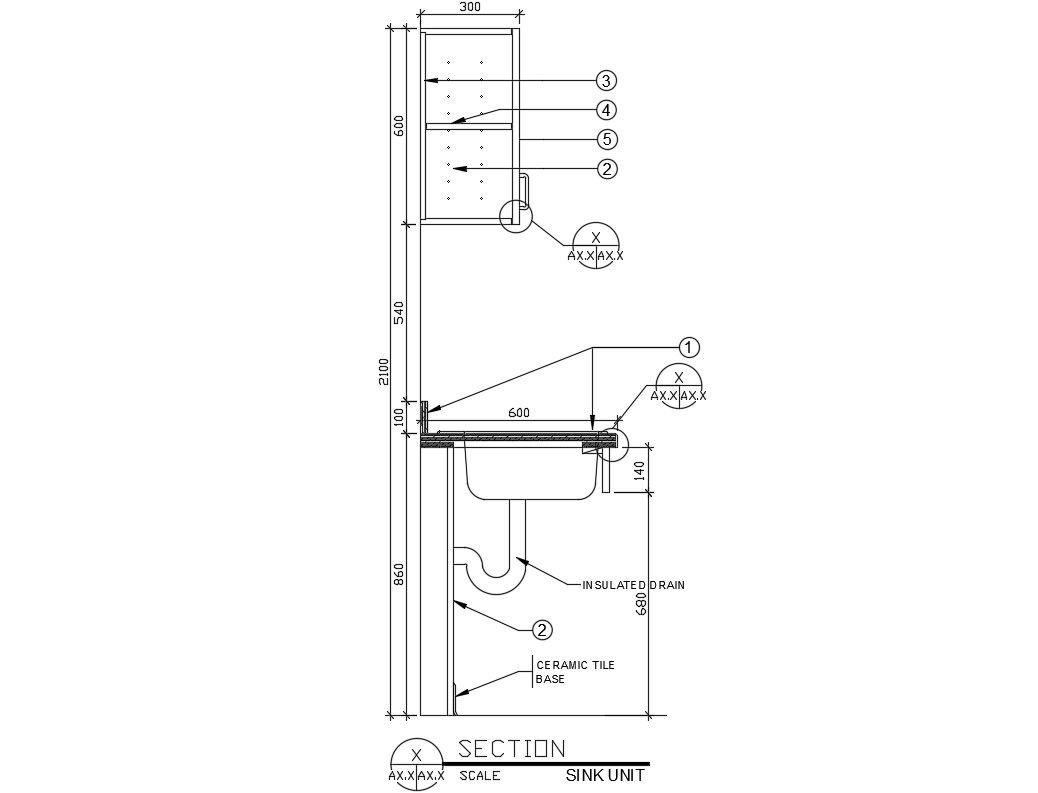 Section Of Wash Basin With Cabinet AutoCAD Drawing Free File; section of basin detail with pipe, cabinet, texting and also a detail of a sandwich cut platform CAD file free.