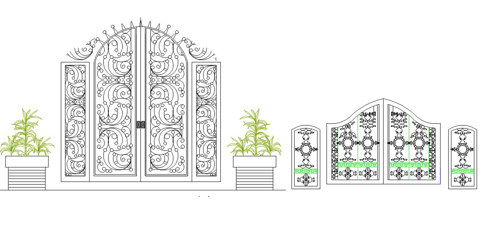 Iron Main Gate Elevation Design DWG File; download free AutoCAD file of 2 different iron main gate elevation designs.