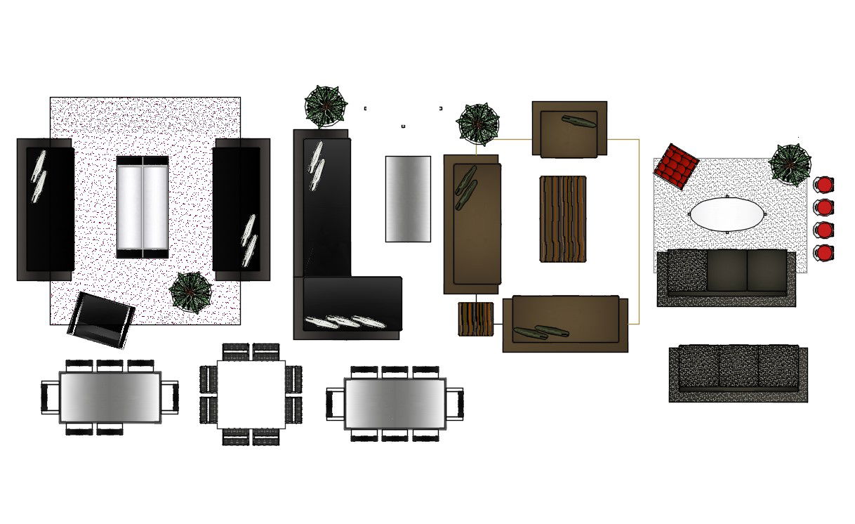 Furniture AutoCAD Free Blocks; download free AutoCAD file of furniture CAD blocks shows drawing-room set, sofa set with central table and dining table.