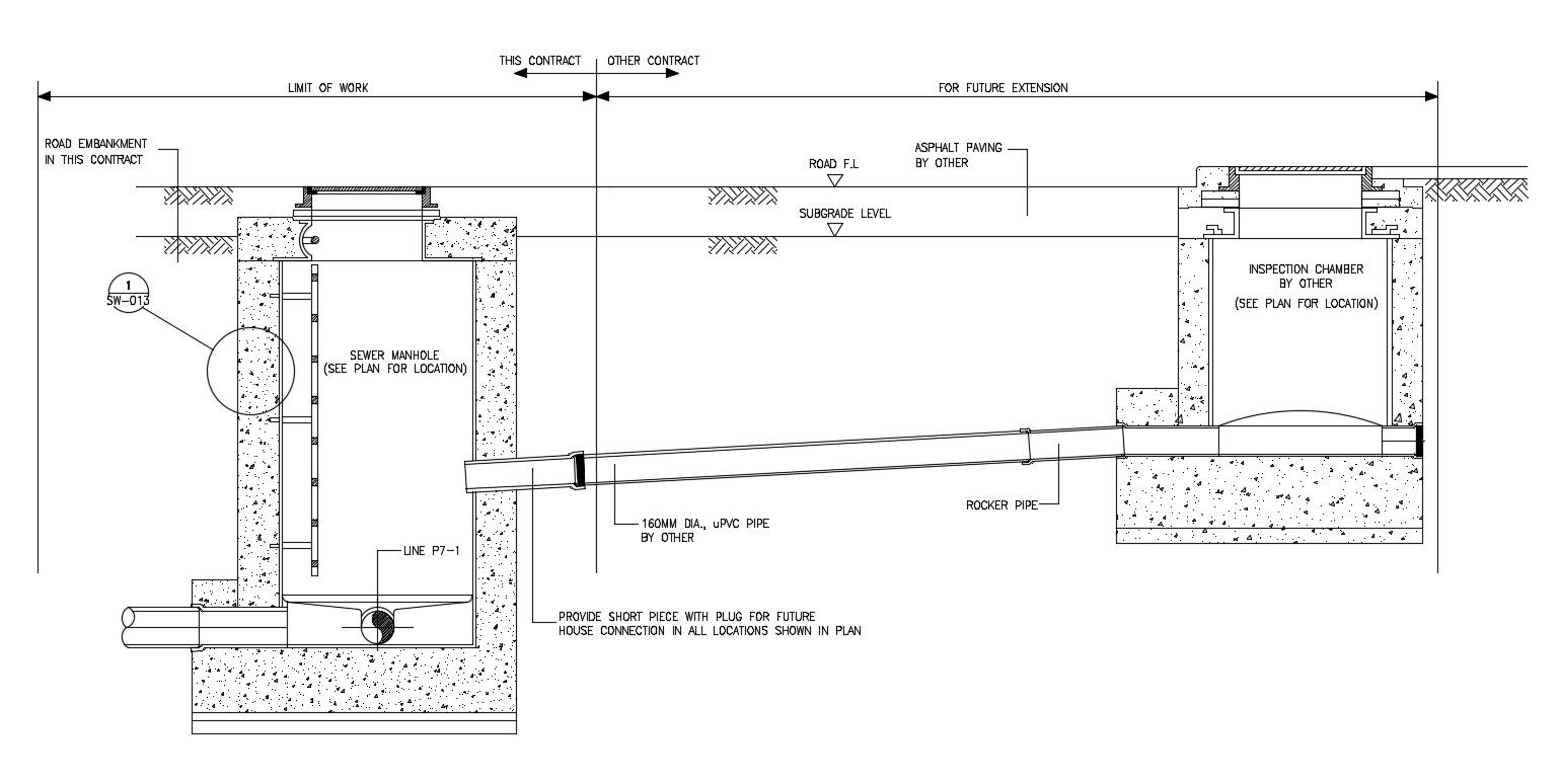 Sewer Lateral Connection Detail AutoCAD File Free; detail of sewer construction with manhole, inspection chamber CAD file free.