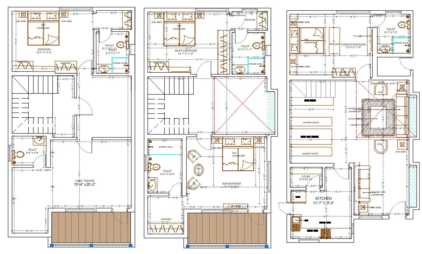 4 BHK Architecture House Plan DWG File; the architecture 3 storey house building floor plan with furniture layout plan includes 4 master bedroom, modular kitchen, dining area, home theatre, and drawing room with all dimension and description detail.