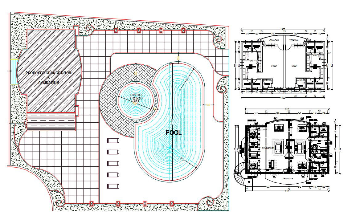 Swimming Pool Plan AutoCAD Drawing; The layout plan of swimming pool, gym, locker and shower room with a furniture layout and dimension detail.