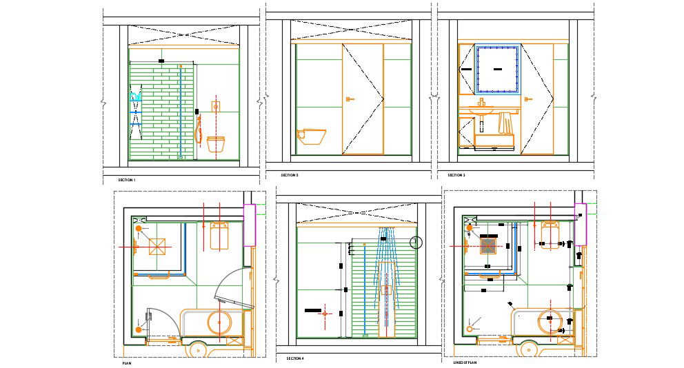 Plan and Sectional design of sanitary bathroom layout that shows a different sectional view of the bathroom along with bathroom ware details of washbasin, water closet, shower units, and some plumbing blocks design in bathroom download CAD drawing for detailed work drawing.