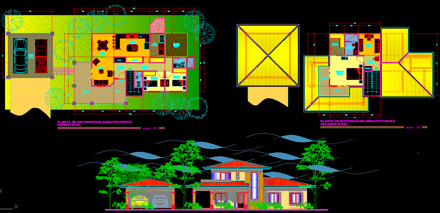 This AutoCAD DWG file presents a detailed modern bungalow design featuring a fully dimensioned ground and first-floor plan, roof layout, and rendered elevation. The plan includes furniture arrangements, car parking space, a living and dining area, bedrooms, kitchen layout, and open green zones. The elevation showcases a contemporary exterior with sloped roofs, wide windows, and realistic architectural detailing, ideal for client presentations or design inspiration.