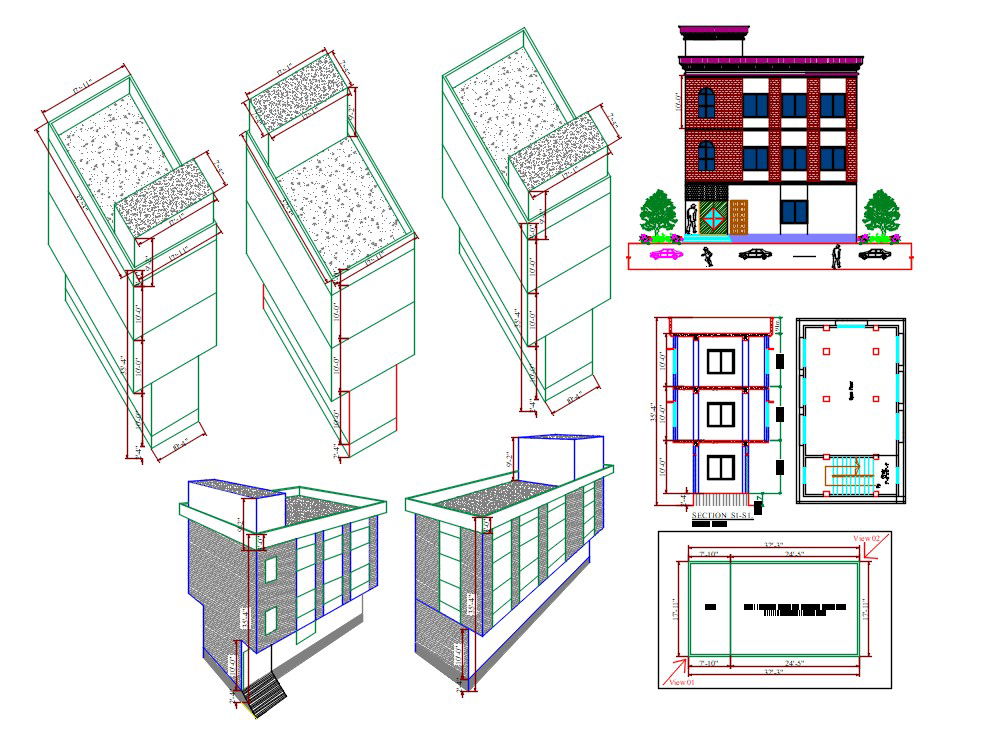 32 FT * 17 FT Size Office Building DWG File; 2d CAD drawing of office building built-up area 83219.39 square in. (577.9124 square ft.) with column layout plan, front elevation detail and isometric view of 3 storey office building. download DWG file of office building and collect idea of CAD drawing for your reference file