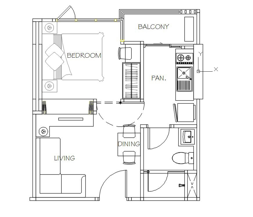 Small House Plan Free DWG File; download free AutoCAD file of small house Furniture Layout plan includes 1 bedroom, kitchen, toilet, and living room.