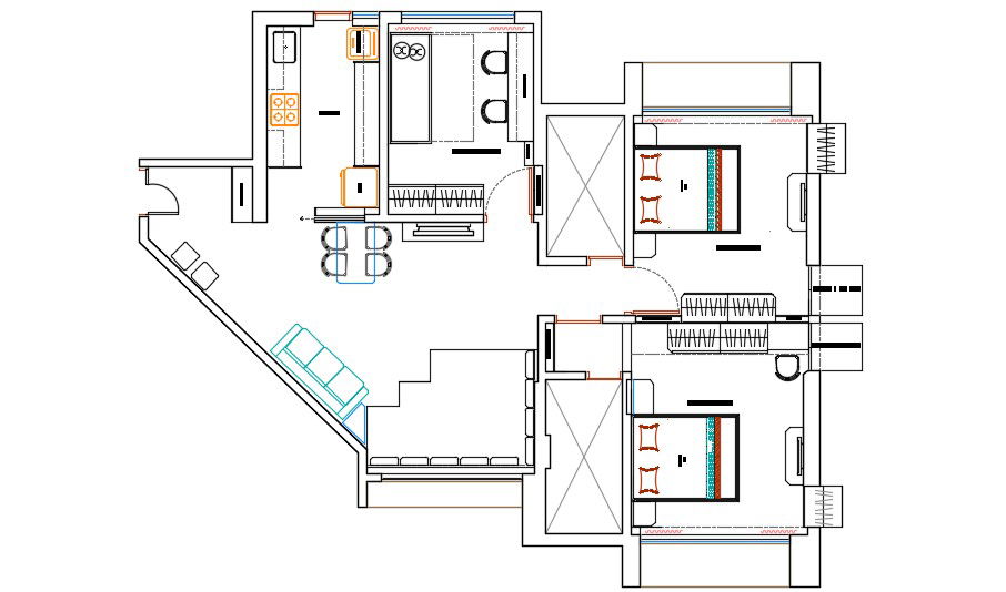 Furniture layout design 2 bhk house that shows single story house plan details along with room details of drawing-room, 2 bedrooms, kitchen and dining area, sanitary t6oilet and bathroom, download CAD file.