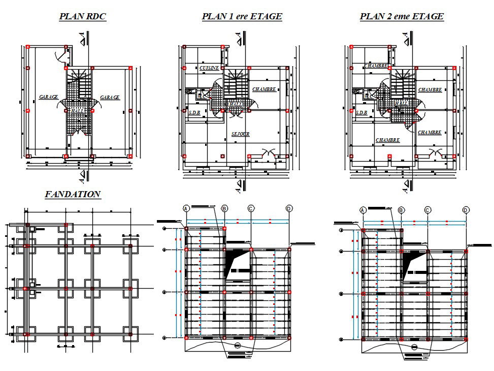House Construction Plan CAD Drawing; download AutoCAD file of house project CAD drawing includes a foundation plan, layout plan with 4 BHK first floor and second-floor plan.
