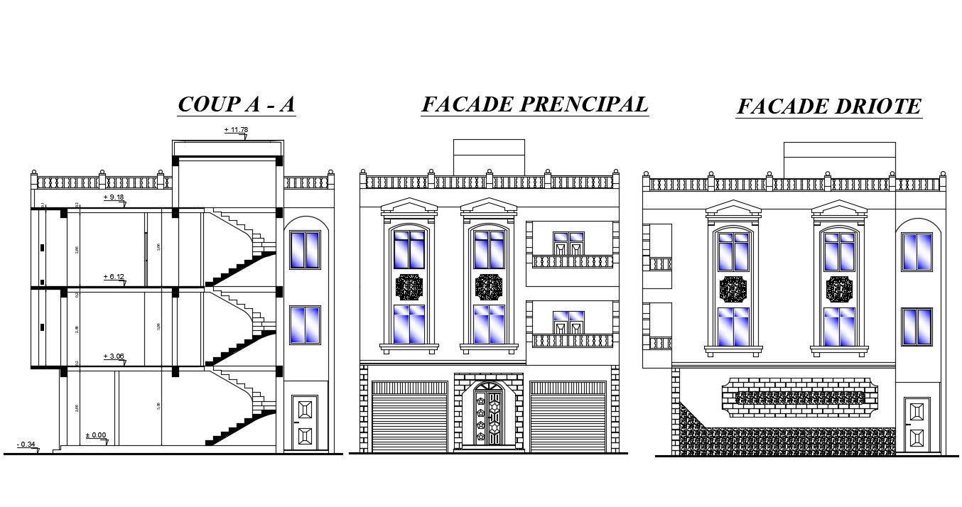 House Section And Elevation CAD Drawing; 2d CAD drawing of house building section and elevation design shows 3 storey building structure and dimension detail.