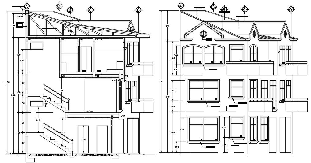 Residential housing bungalow design elevation and section drawing that shows house roof ceiling design along with bungalow floor level details, bungalow height, staircase, and various other units details download CAD drawing.