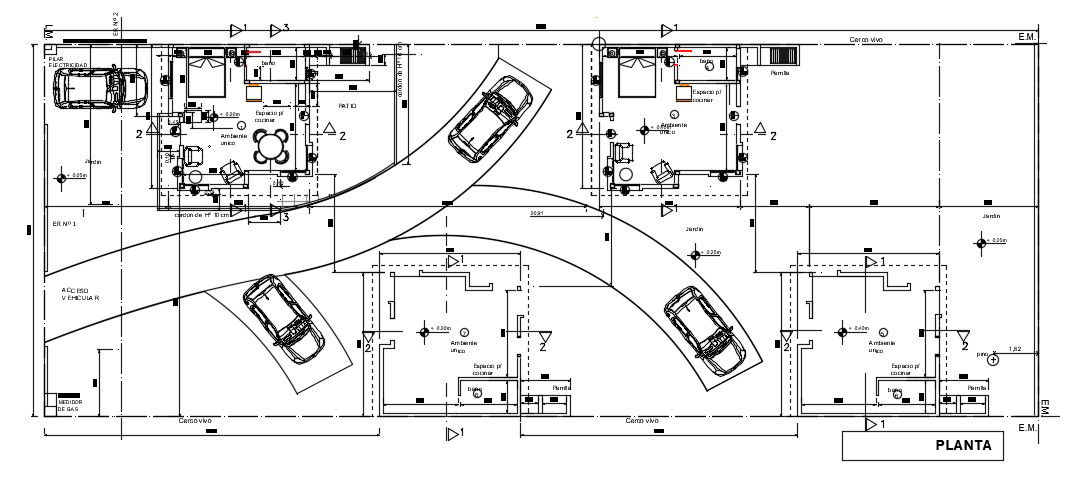 Residential house details in an area that show area boundary details along with one bhk houses design details in a residential area with section line, parking space and various other details download CAD drawing.